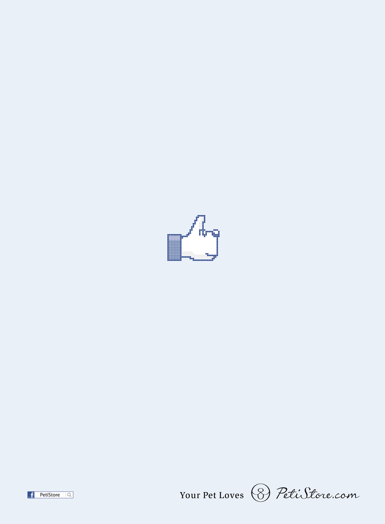 This simply designed advertisement has been created for an online shop selling high-quality domestic pet products. Its central element is the Facebook “Like” icon, which has been altered to look like a smiling dog. It communicates the core message that both pet owners as well as pets like the product of the supplier. The visual is complemented with the tagline “Your pet loves”, which has the double meaning of “what your pet loves” and “your favourite loves”.