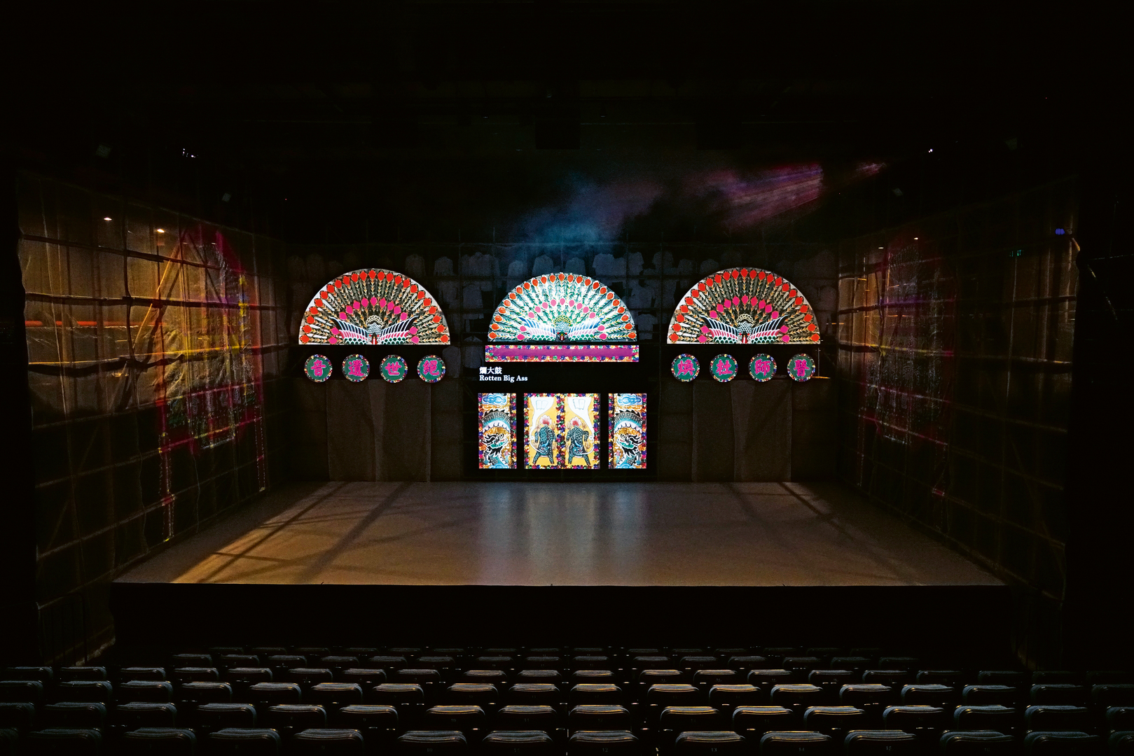 The Z Innovation Lab, held in Hong Kong in 2019, was dedicated to integrating the latest stage technology and innovative ideas in the live arts. Therefore, a giant bamboo “Flower Plaque” installation measuring seventeen by five metres was erected in the Hong Kong Cultural Centre to celebrate its 30th anniversary. The design concept visualises the tradition with an LED display fan showing holograms, light painting and a light web knitted by LED bulbs. The idea was to address, with a touch of technology, the celebratory mood represented by red fabrics, tungsten light bulbs and a traditional peacock positioned on top.