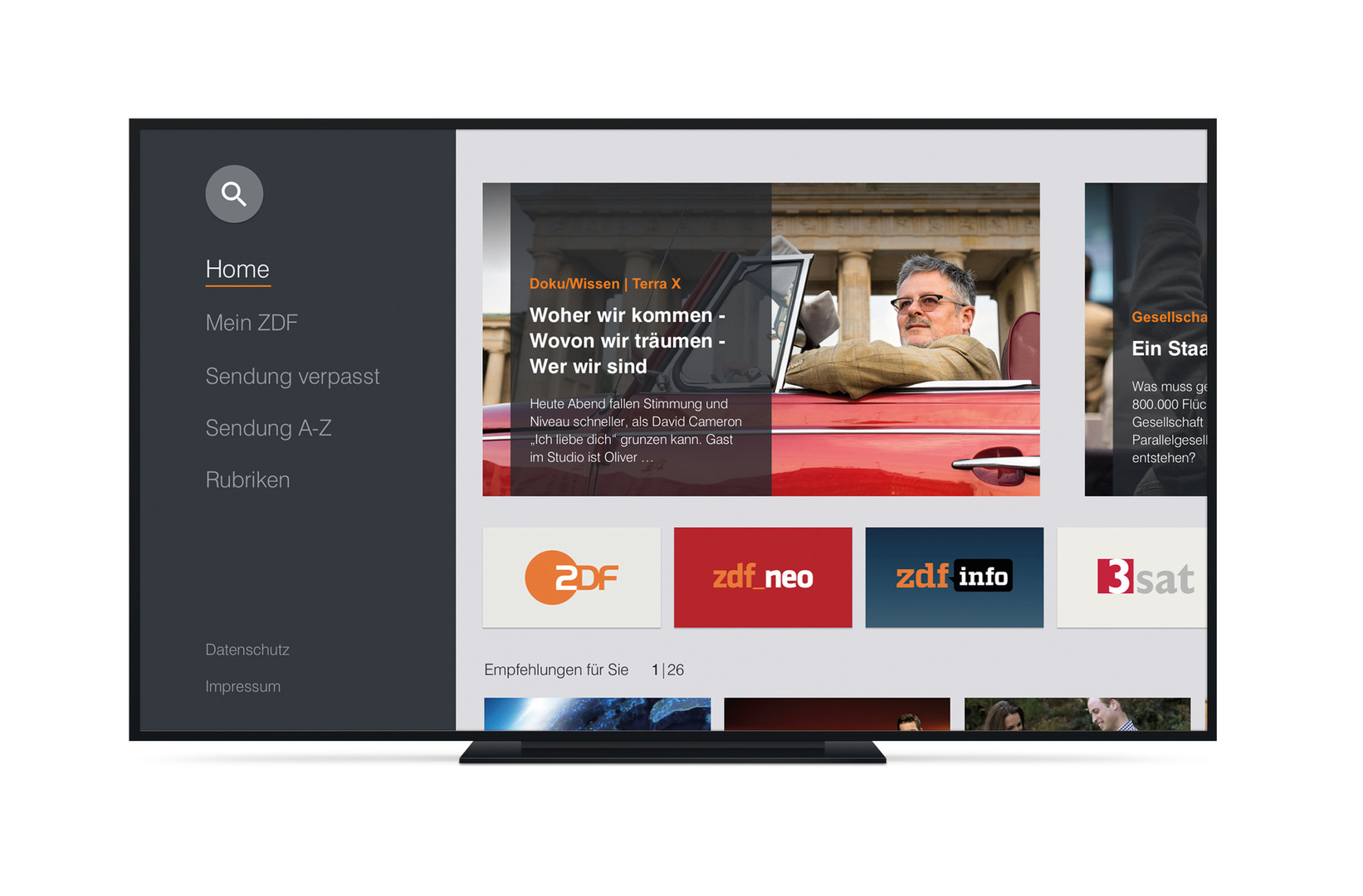 With the launch of the new ZDFmediathek app, the entire media content of all television channels of the Zweites Deutsches Fernsehen is avail- able on all smart screens. Thanks to the integrated video player, the native app ensures the best possible image. A complex back-end structure guarantees high performance even for slow Internet connections. The consistent design of the user interface on all digital devices creates high recognition value. Furthermore, via Second Screen Technology, the app provides interactive real-time features parallel to the current broadcast.