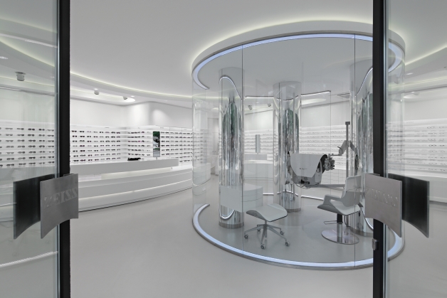 Gleaming white dominates the ambience of the Zeiss optician store at Kurfürstendamm in Berlin. The soft curves of the shelves and furniture shape the minimalist architecture of the shop in a natural way. The instruments for the eye measurement are an eye-catcher and they are presented and staged as in a show performance: illuminated with white-blue LEDs, the technology is presented in a transparent glass rotunda. Once the customers have a seat, swivelling and height-adjustable measuring instruments take them for a journey into the future of optometry.