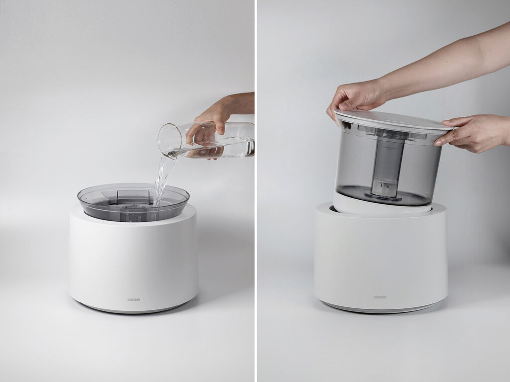 The Zero Pot humidifier blends minimalist design with functionality. Its compact form houses the water tank, while an optimised airflow minimises operating noise. By simply turning the top section users can adjust the direction of humidification, while a seamless control panel with tactile markings ensures hygienic and intuitive operation. Textured surfaces combined with soft lighting at the base create a calming atmosphere. All water-bearing components are removable and easy to clean.