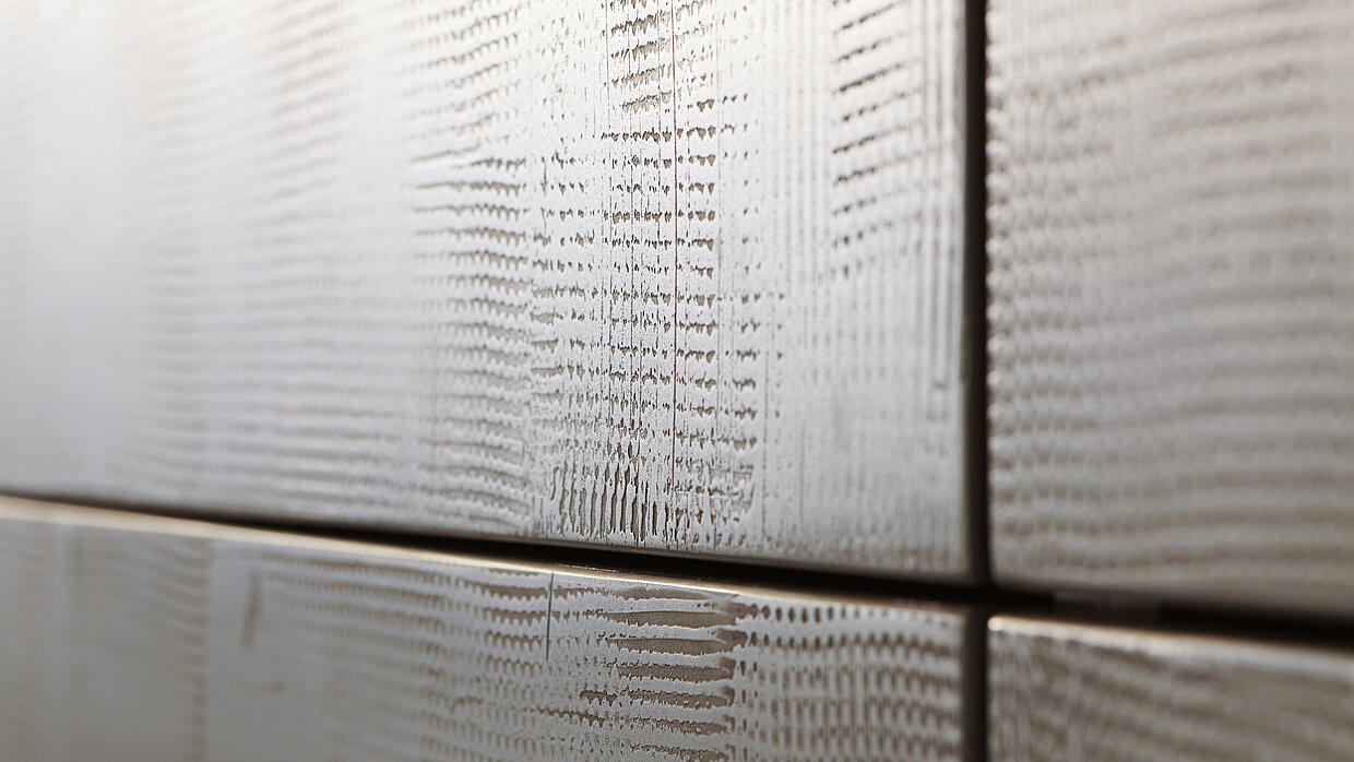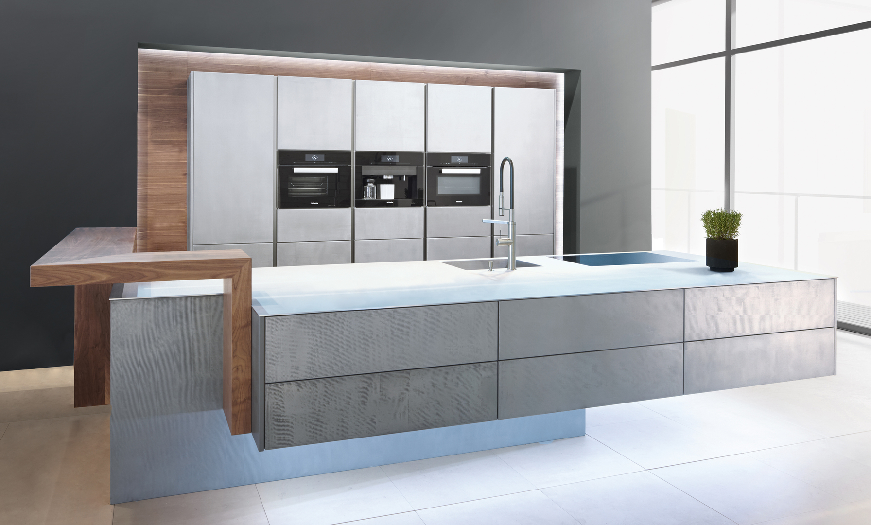 The zeyko Flybridge statics system allows whole sections of cabinets to float seemingly in the air. In the version with handle-less zeyko Metal-X² fronts and a solid worktop of stainless steel, the impression of a closed metal kitchen block is created, whereas the cantilever and the bottom illumination give an effect of floating lightness. The contrasting design of the kitchen island is completed by walnut elements which connect overhead cabinets, counter and block.