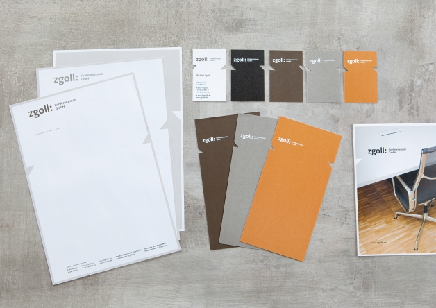First-class, innovative and passionate – these are the standards defining this conference room specialist’s work. This self-understanding is reflected not only in the up-to-date furniture and high-end media technology by company zgoll, but also in its corporate design. A stylised letter “Z” is the main design element for its office stationery and print media, as well as for its web presence. A clearly defined colour palette and print media with triangularly notched edging complement this appealing corporate design.