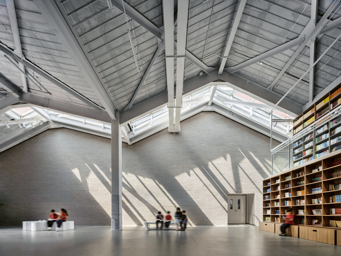 The Zhengze School in Beijing is located in a densely built-up area of the old town, for which numerous building regulations exist. However, by repurposing a former paper mill, existing space capacities could be optimally used for educational purposes. For this, parts of the building were converted into a sports and lecture hall as well as into science labs, and the sports field found is located on the roof. The characteristics of a factory building were preserved, but were sensitively adapted in light colours, with an intelligent lighting concept and special design details.