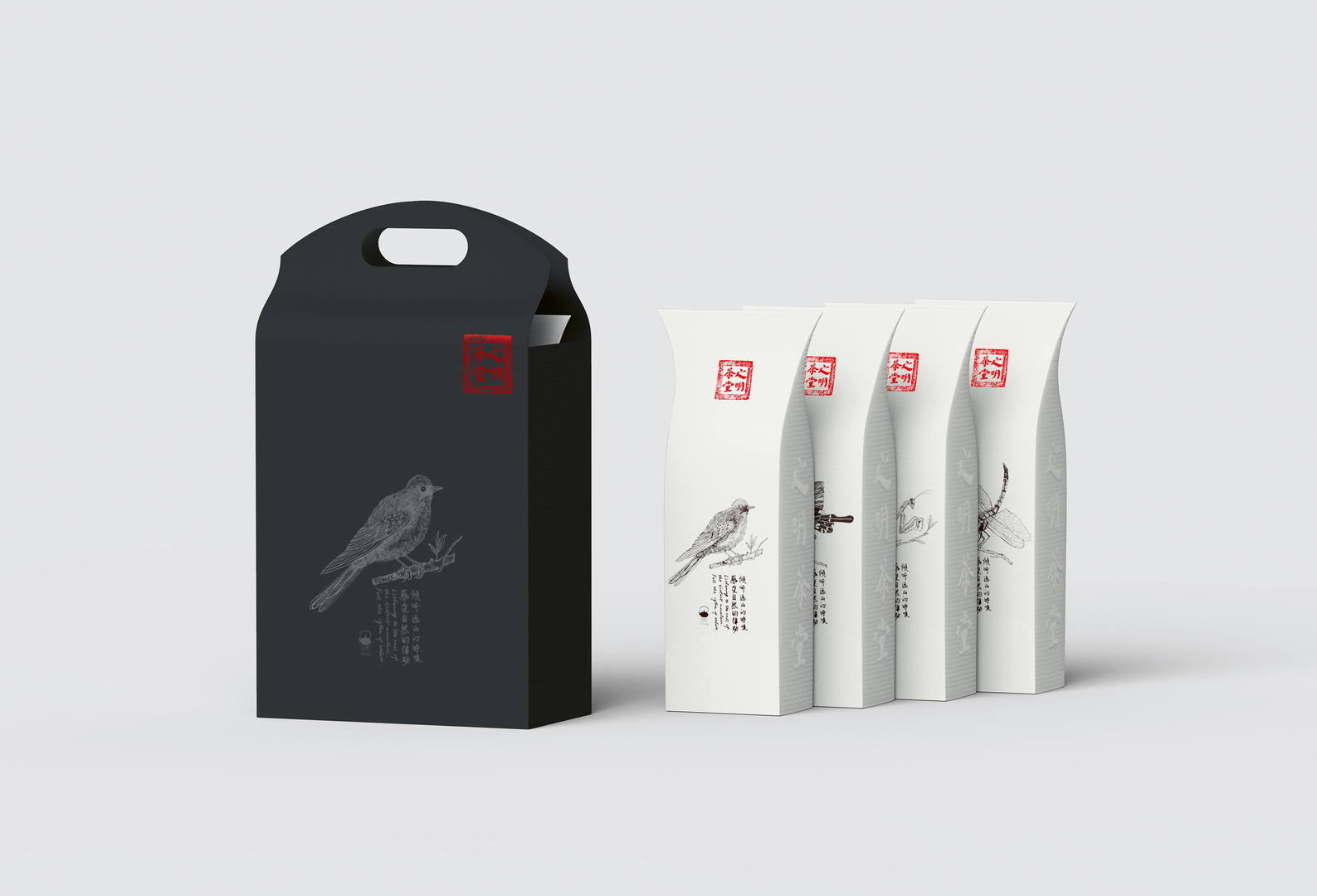 The packaging design of this white tea is inspired by the ecosystem of a tea plantation. Made of elaborately embossed paper, the white bags showcase harmonious contours and a design which focuses on filigree, hand-painted illustrations depicting insects and birds perching on tea plants. The drawings are complemented by short texts in Chinese and English. Otherwise interrupted only by a red signet, the black-and-white colour concept exudes a high sense of elegance. A paper carrying bag, which is designed in inverted colours, rounds off the concept.