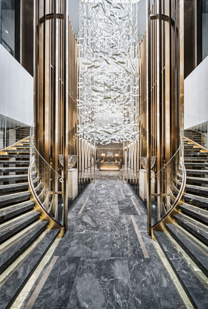 This clubhouse includes cafés, gymnasiums, yoga classrooms, libraries, teahouses and children’s learning areas. At the heart of the design concept is the creation of spatial order. Two sweeping staircases dominate the appearance of the lobby. A luminaire that reminds one of a waterfall serves as an eye-catcher. It is surrounded by a lattice-like screen. The sophisticated combination of stairwell, luminaire and screen makes the impression of a work of art.