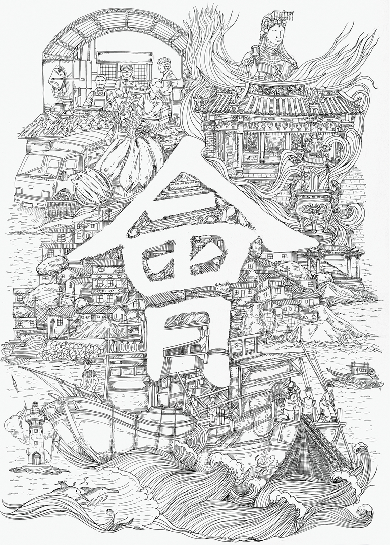 The book “Zi Hui Taiwan” illustrates the City of Taiwan with a combination of texts and drawings. The eight illustrations in total convey the lifestyle of the people, their everyday lives and cul-ture. There is no focus on any concrete visual features or individual city sights. Instead, the black-and-white images rich in detail also reflect the social and cultural values of the city and give the observer the feeling of gaining a holistic view and visual experience of Taiwanese city life.