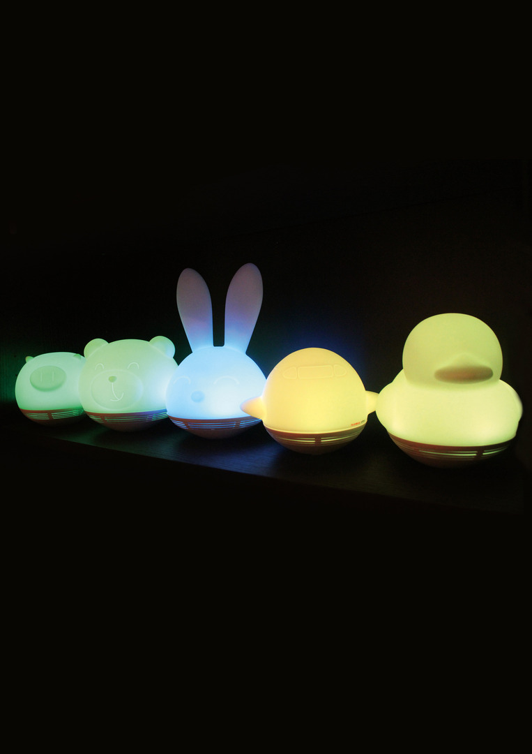 Zoocoro is a Bluetooth speaker light which can be controlled from a smartphone. The flush-mounted light and loudspeaker combination comes with popular animal motifs such as a bear, a duck, a piglet and a whale. Made of soft vinyl, Zoocoro is intended to appeal to users of all ages. The device can be controlled intuitively and is suitable for providing atmospheric lighting in children’s rooms and bedrooms.