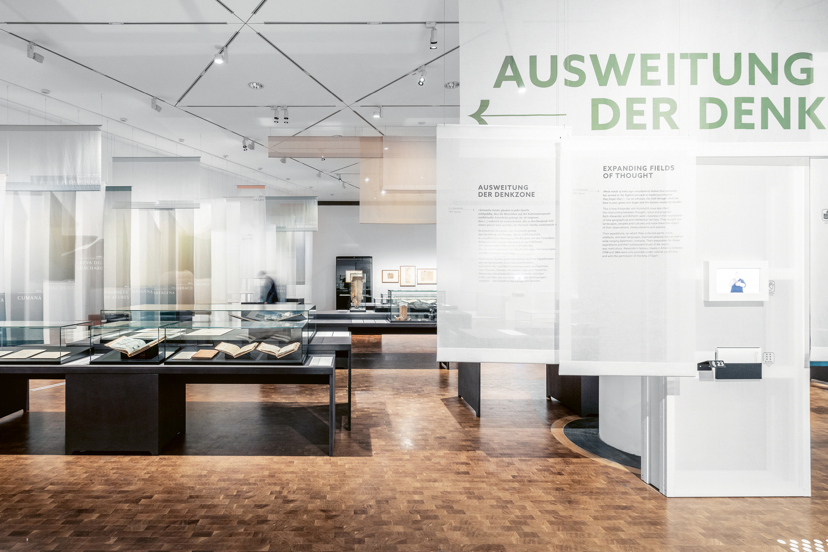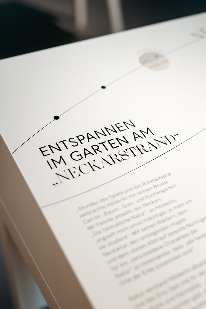 The exhibition design at the Hölderlin House is based on Hölderlin’s quote “Would I like to be a comet? I think so.” Translucent walls with celestial bodies representing Hölderlin’s places of residence give the room structure, while the exhibition furniture is modelled on school desks, symbolising the poet’s education.
