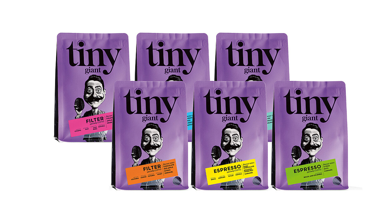 The striking packaging design for the new coffee brand Tiny Giant is defined by a surreal subject and bright hues. Colourful stickers were used to differentiate between the varieties, thereby enhancing design, sustainability and cost efficiency.