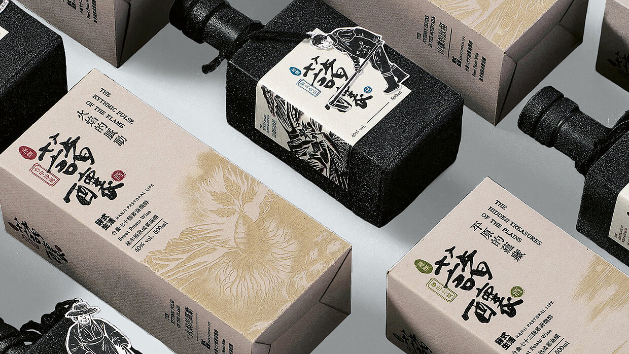For their bachelor’s degree, five students of the Visual Communication Design department of China University of Technology focused on the sweet potato wine industry in Taiwan. They created fascinating storytelling for a brand that fuses tradition with modern aesthetics. Woodcut-like illustrations on the bottle labels visualise different growing environments. The labels are complemented by contour-punched paper tags on the bottle neck that depict agricultural workers and their tools. Packaged in an elegant folding box, the product not only appeals on a visual and tactile level but also displays a sustainable design concept.