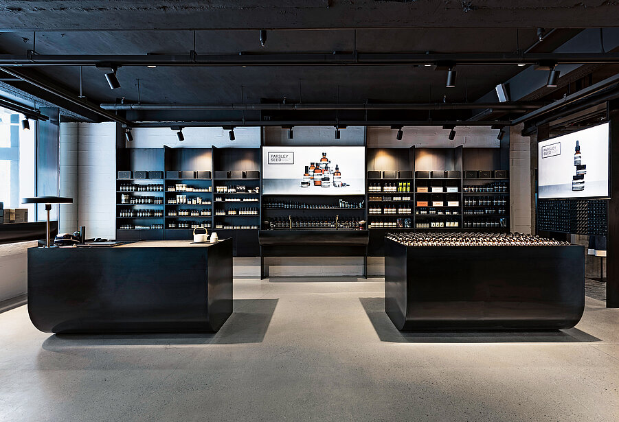 Genesis Suji is a study in contrasts. For the lobby, rough concrete and weathering Corten steel were chosen for their contrast with Genesis’ sleek, shimmering vehicles. In the same way, the building’s central elevator core is wrapped in gun-metal hot-rolled steel; its customised cabs open to reveal an interior finished in anodised copper. At the same time, we wanted to make visitors feel a tactile warmth throughout the space. Oak ceilings in the entire building thus create a living room feeling.