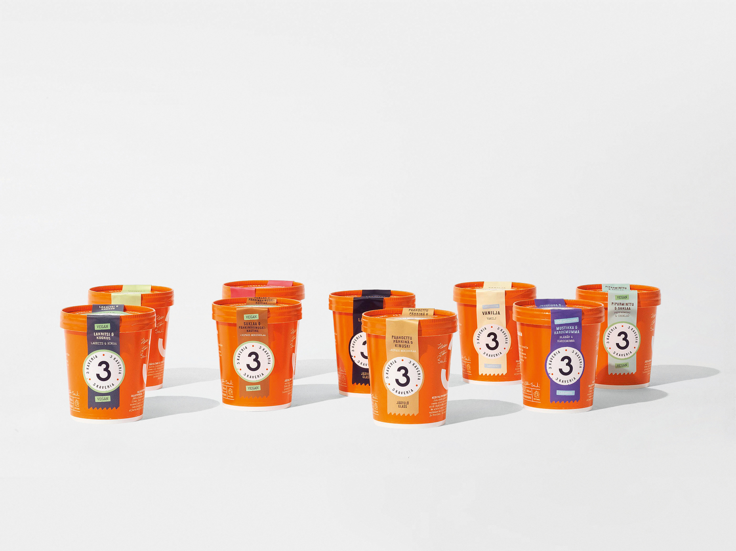 The development of this new visual identity was aimed at promoting the sales of a Finnish ice cream on international markets. In order to attract attention and clearly stand out in supermarket freezers, the design places a stronger emphasis on the brand name “3 Kaveria” (3 Friends), which is printed around the cylindrical ice cream cup in capital letters. The cup itself features the brand’s iconic orange colour, which was tuned a little brighter for the new design. Clear signets and colour IDs on the closing seal help to distinguish the different product types.