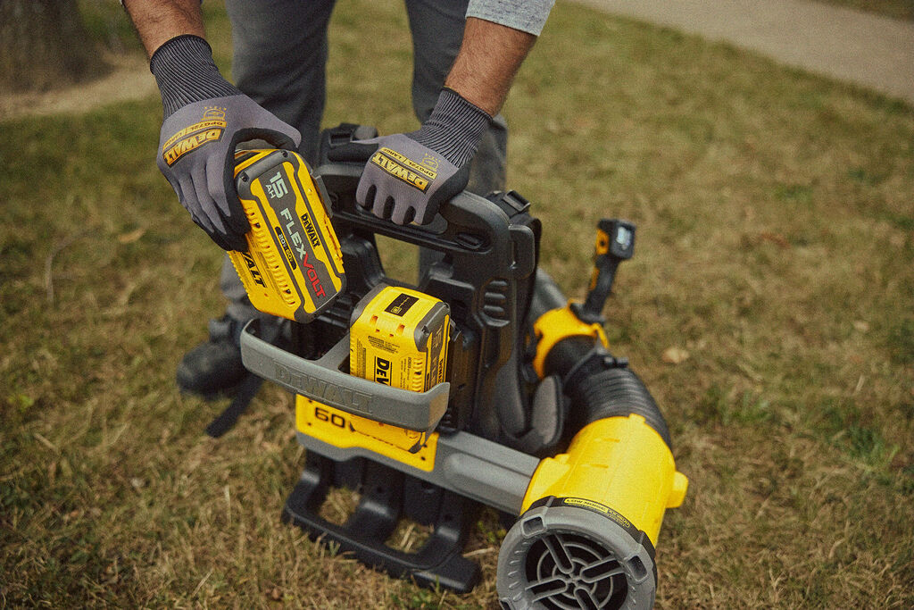 The 60V MAX* Brushless Backpack Blower effectively clears leaves and stubborn dirt. The unit is equipped with an ergonomic joystick control as well as a digital speed control and a clear display for real-time feedback. A waist belt and padded shoulder straps, which can be replaced if necessary, also contribute to ergonomic comfort. The placement of the batteries on the back plate has been designed with a balanced weight distribution in mind.