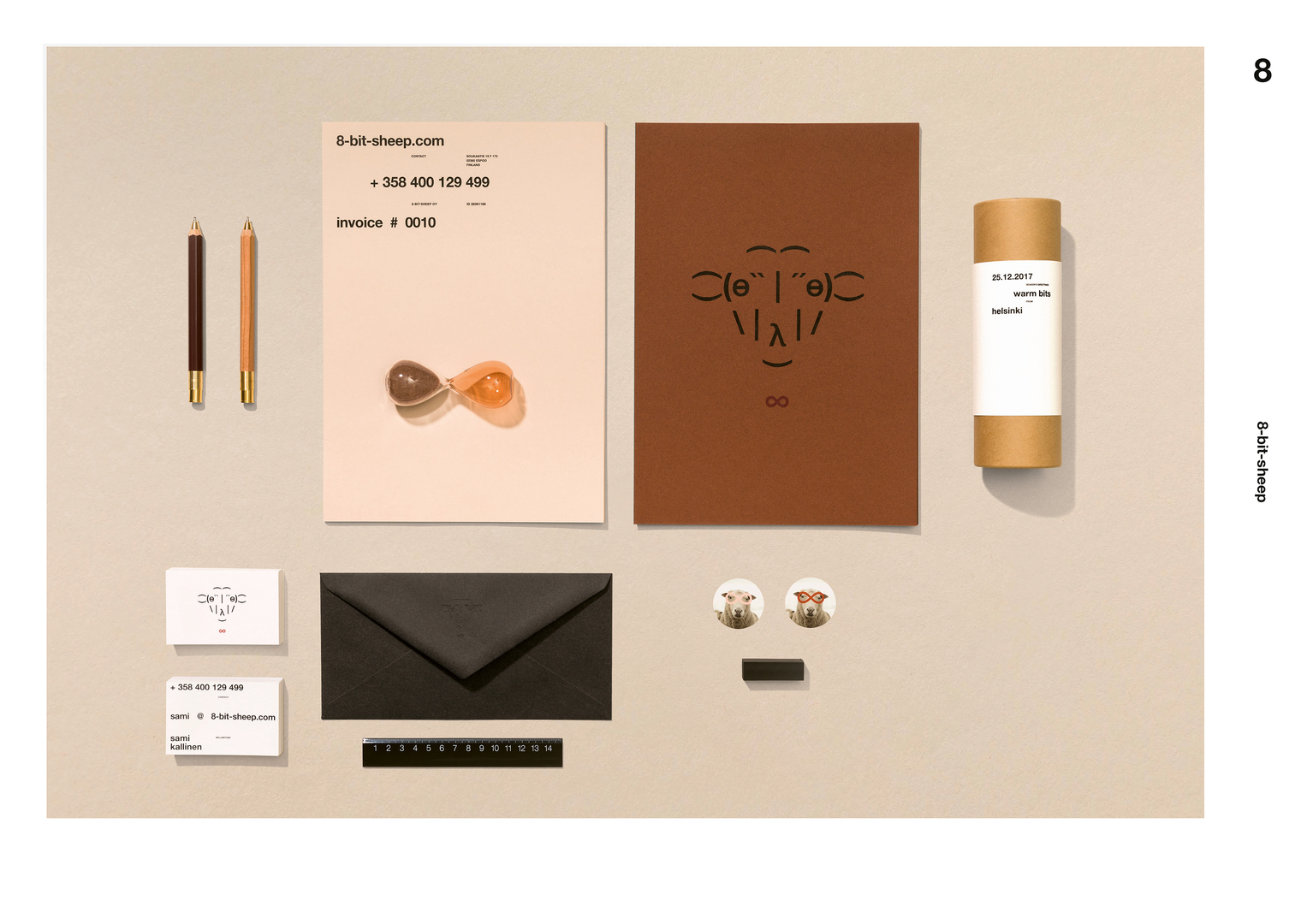8-bit-sheep is a new digital strategy network which helps established brands to define and implement an innovative approach for digital transition. The company name is a nod towards Philip K. Dick’s classic science-fiction novel “Do Androids Dream of Electric Sheep”. The logo, an ASCII-lamb, made entirely of Helvetica glyphs, is the central part of this corporate design. Greek characters, commonly used in HTML and Unicode, are well-recognised within the tech community. Appropriately enough, the 11th letter of the Greek alphabet, which is pronounced lambda, is positioned as the nose. The horizontally positioned number 8 occurs as an infinity symbol and serves in the logo as a bow-tie for the sheep to make it look businesslike.