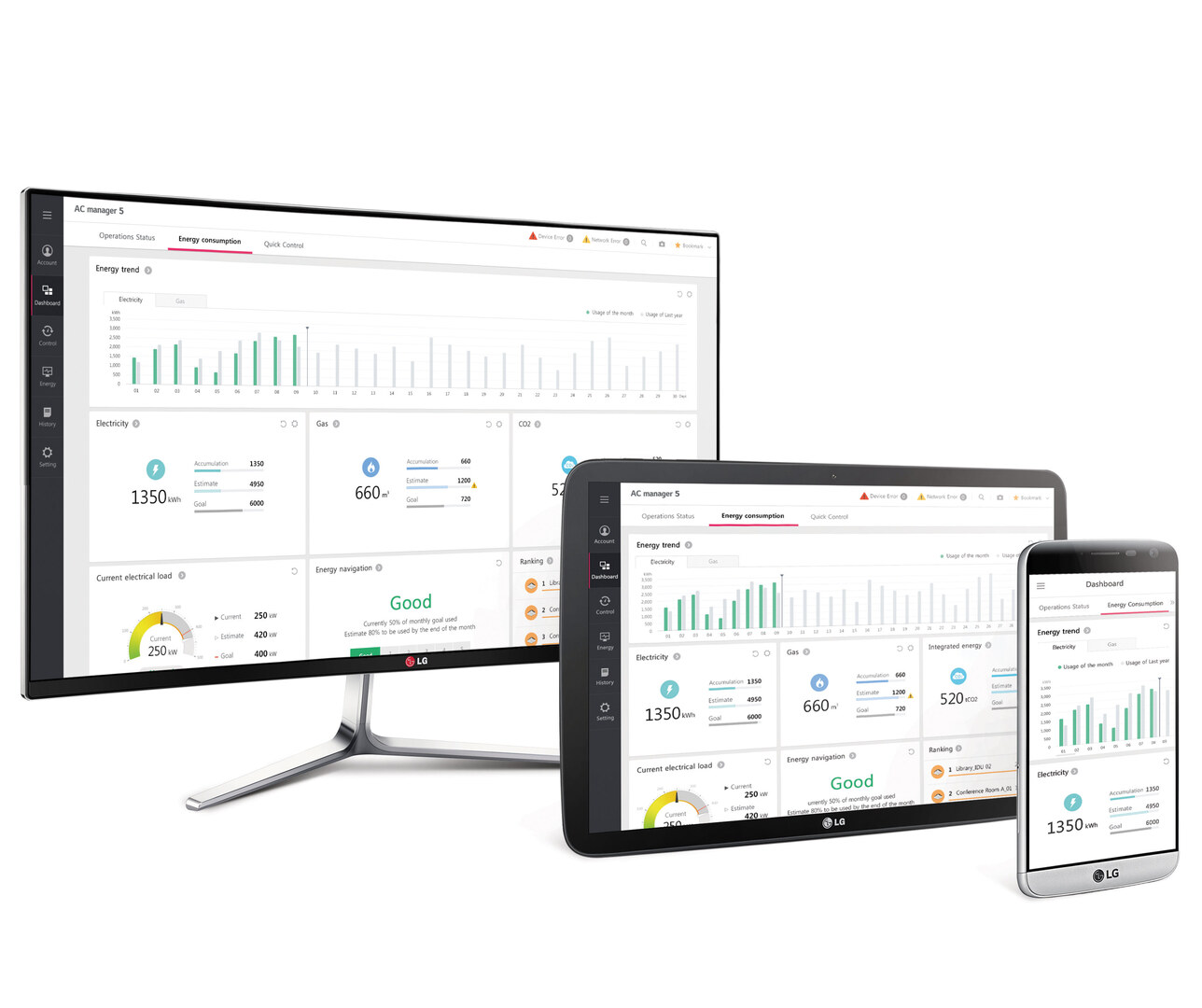 AC manager 5 is a new control solution that enables centralised control and management of a building’s HVAC system (heating, ventilation, and air conditioning). HTML5-based responsive web technology has been applied to provide consistent usability on any mobile device. Based on various intelligent functions, including environment-sensor-based IoT UX and goal-based automatic energy-saving algorithms, managers can maintain sites in a smart and comfortable yet energy-efficient manner at all times.