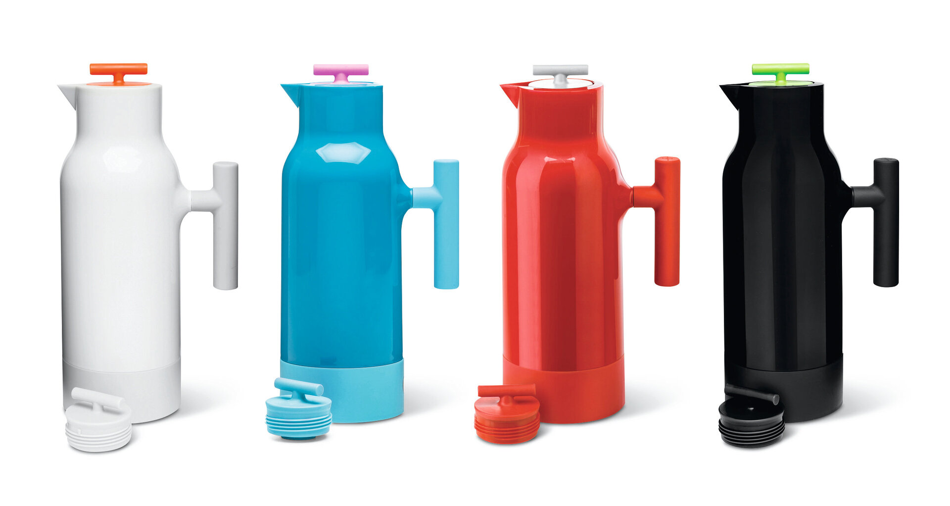 The contours of this vacuum flask are reminiscent of a wine bottle or a jug and take up the aesthetics of historical culinary culture. The symmetrically positioned handles constitute a distinctively contemporary detail. The rubberised grip was designed according to ergonomic aspects in particular and is extremely sturdy. The drip-free flask comes with two lids of different colours, allowing users to alter its appearance at any time.