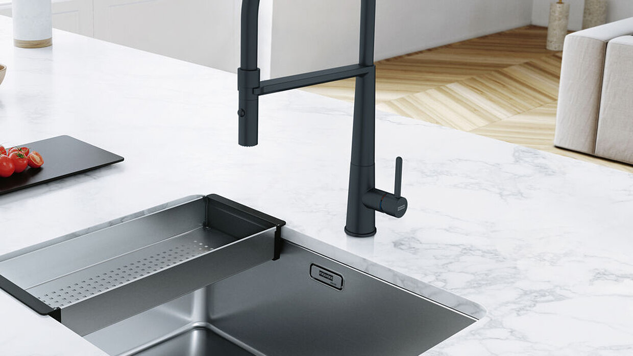 The Active Twist fitting and the Kubus 2 sink have emerged as a high-quality kitchen system. The integrated drain valve in the fitting is an innovative solution that, together with the large sink, offers the user real added-value. In addition, the matt black surface is impressive, which is in harmony with the purist design language and meets sophisticated demands towards kitchen equipment in a unique way.
