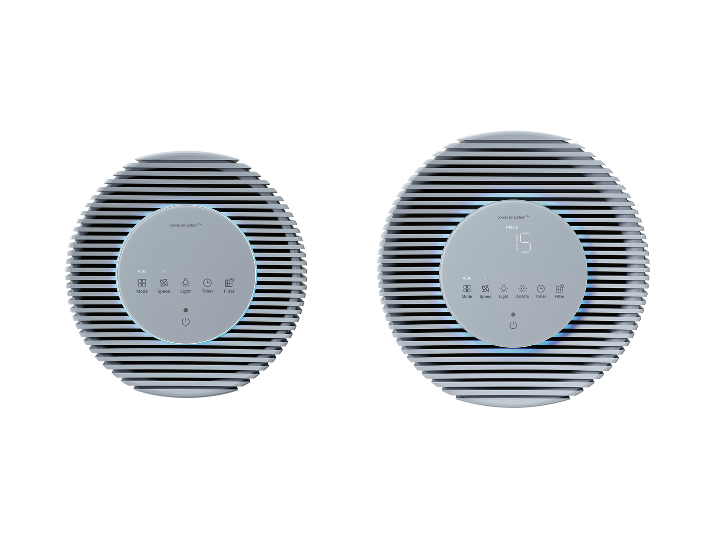 Airmega350 and Airmega450 are air purifiers whose appearance is characterised by a cylindrical shape and a horizontal pattern on the top of the housing. This merges seamlessly into a vertical groove structure on the body, which visually connects the air inlet at the top with the outlet at the bottom. The air intake is integrated inconspicuously at the rear. The user interface on the top allows you to choose between three filter types and functions and to control the air quality.