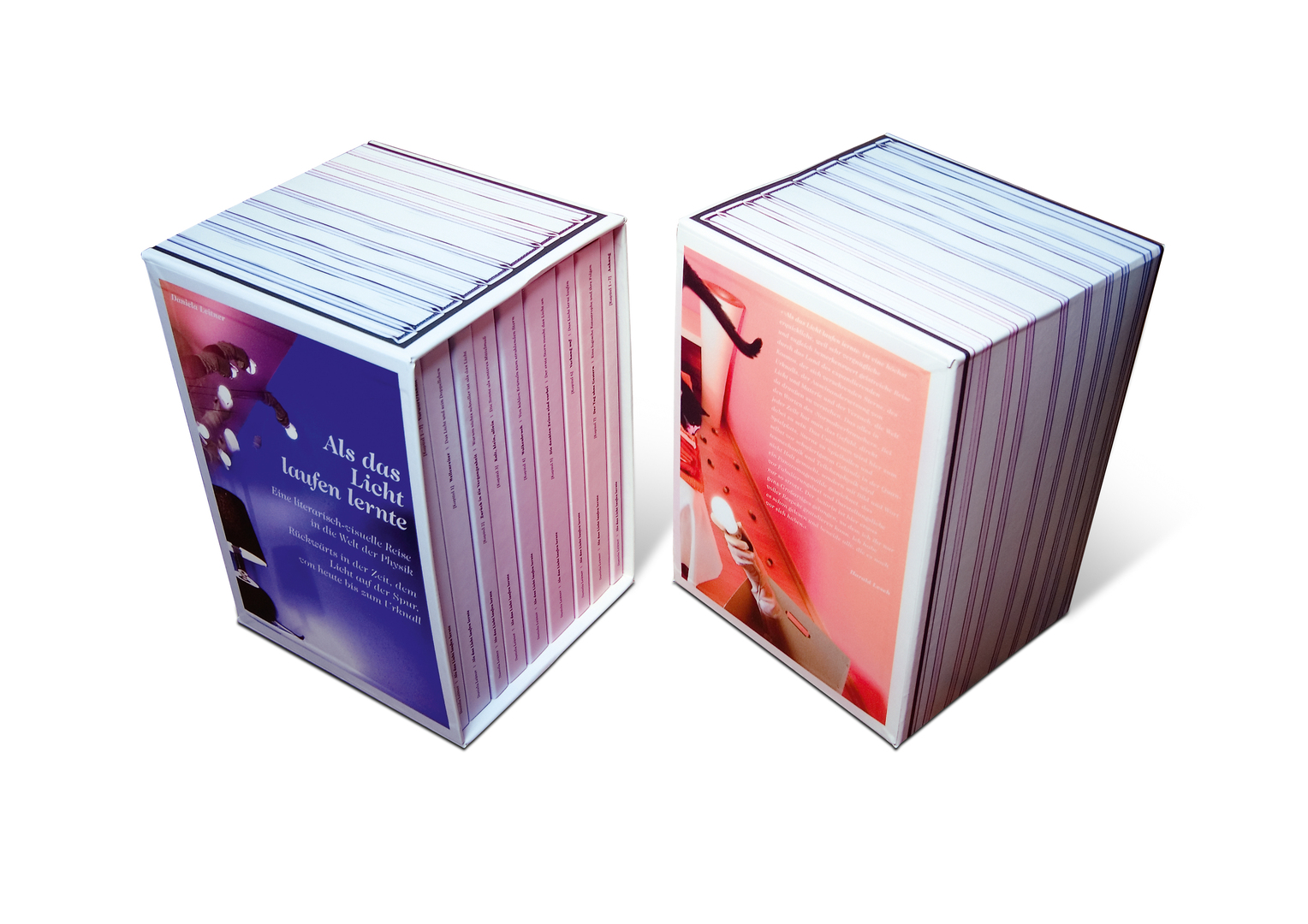 Staging light as a physical phenomenon on more than 1,000 pages is this nine-part book series. The author humorously explains relevant topics, using the course of a day in her flat as an example, starting backwards from going to bed at night (quantum mechanics) to getting up in the morning (the Big Bang). The so-called “red shift” of light serves as a visual, connecting theme. This effect makes light appear redder the further away its emanation source is located. Correspondingly, the colours of the chapter pages and several illustrations gradually change from purple to red. The project was inspired by a television science programme and the responsible astrophysicist, who also supervised this dissertation.