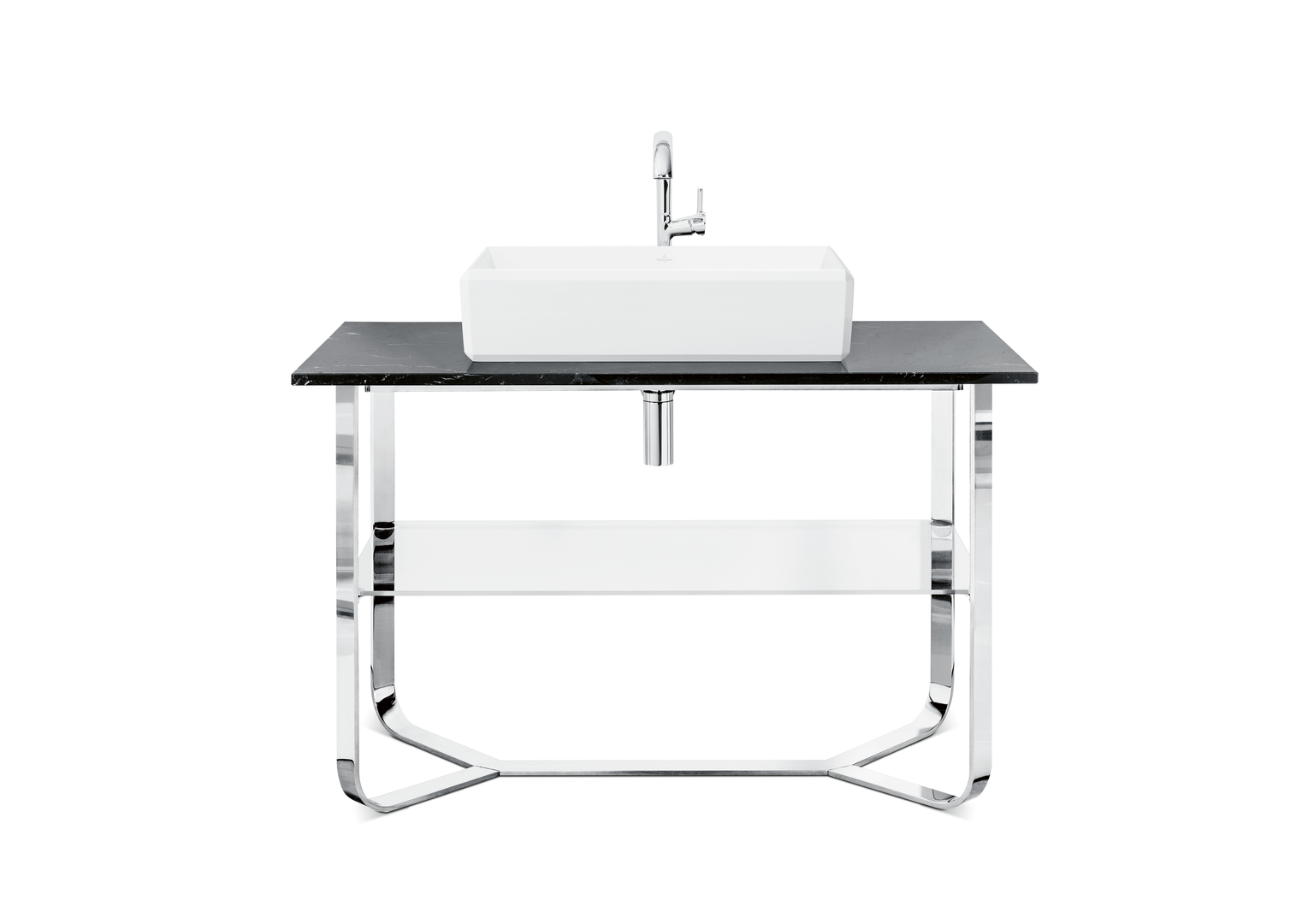 The design concept of the Antheus washbasin is inspired by modern style classics. High-quality materials merge with art deco forms and purist Bauhaus design. A high-quality stainless steel frame and an elegant marble top showcase the surface-mounted washbasin. The facet cut of the ceramic lends Antheus a graceful lightness, while the innovative TitanCeram material allows for uniquely defined edges.