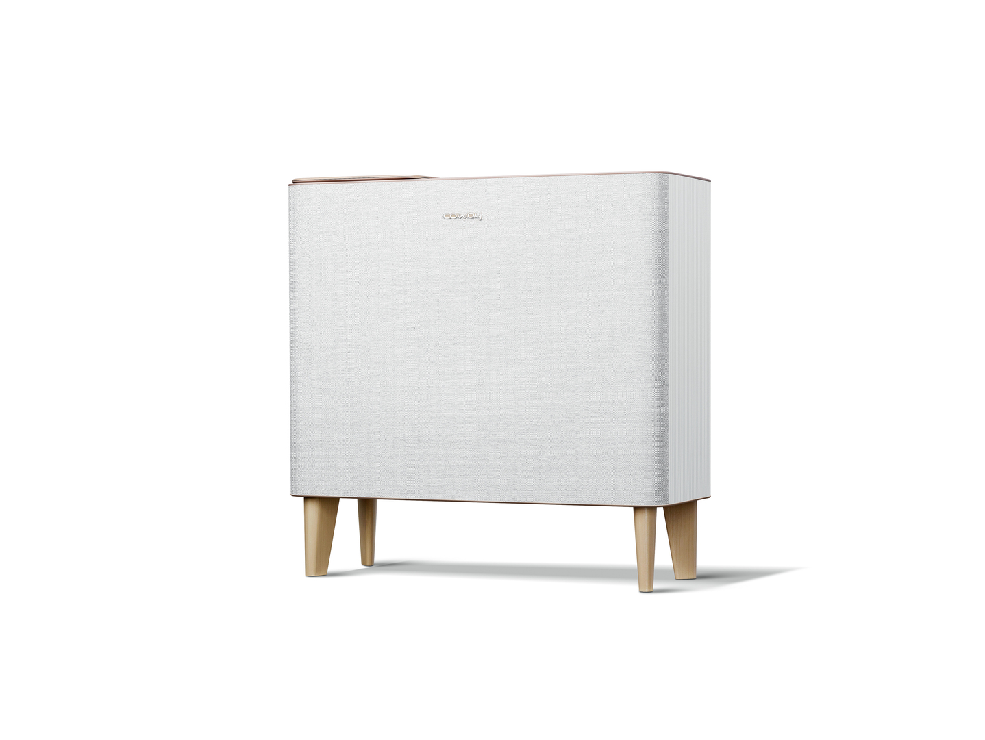 The design of the air purifier is inspired by the look of a piece of furniture. The gently rounded base body stands on four slim wooden legs and is covered with a fine fabric to lend the device a decorative, homely character. Thanks to its magnetic back, the fabric cover can be exchanged and customised as desired to suit the living environment. With indirect lighting and four colours, the display of the control element provides a pleasant light that can be precisely adjusted.