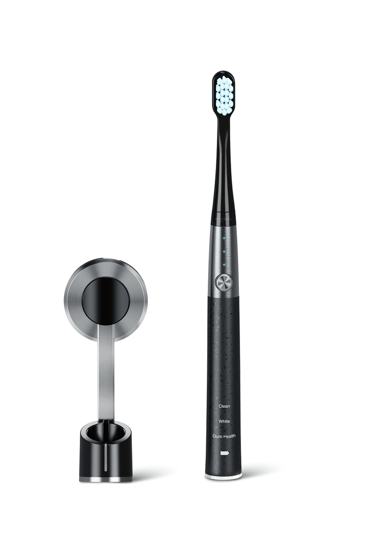 The elegant appearance of this sonic toothbrush is characterised by a black surface studded with glittering particles and an aluminium alloy band on the handle. The brush head is equipped with soft, FDA-certified nylon bristles that help to prevent gum disease and can remedy bad breath. In addition to removing plaque and gently massaging the gums, the device offers a special feature: blue LED light is used to target and reduce unattractive stains on teeth.