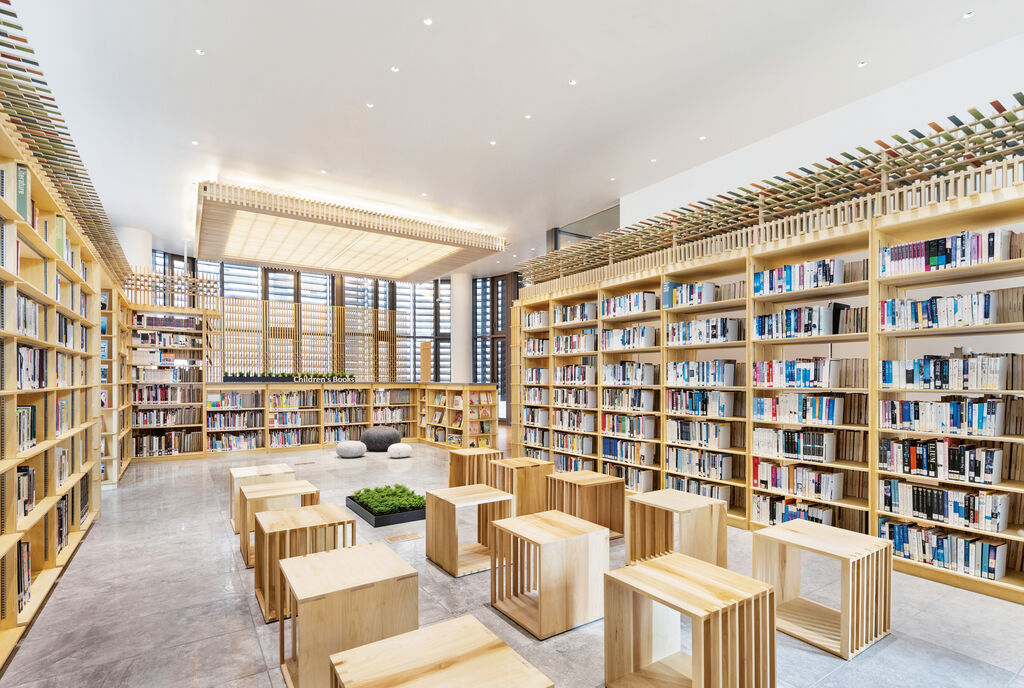 Assembled Void, Library at New York Korea Center in Manhattan, combines traditional Korean architecture with modern design. Shelves form an open rectangle around a courtyard-like space with reading furniture, encouraging movement and interaction. Glass walls facing the roof garden foster a visual link between indoor space and the green outdoors. Modular shelving units with wood, metal and coloured lattice components reinterpret traditional architectural principles. The post-and-lintel wooden assembly reduces material requirements and improves sustainability.