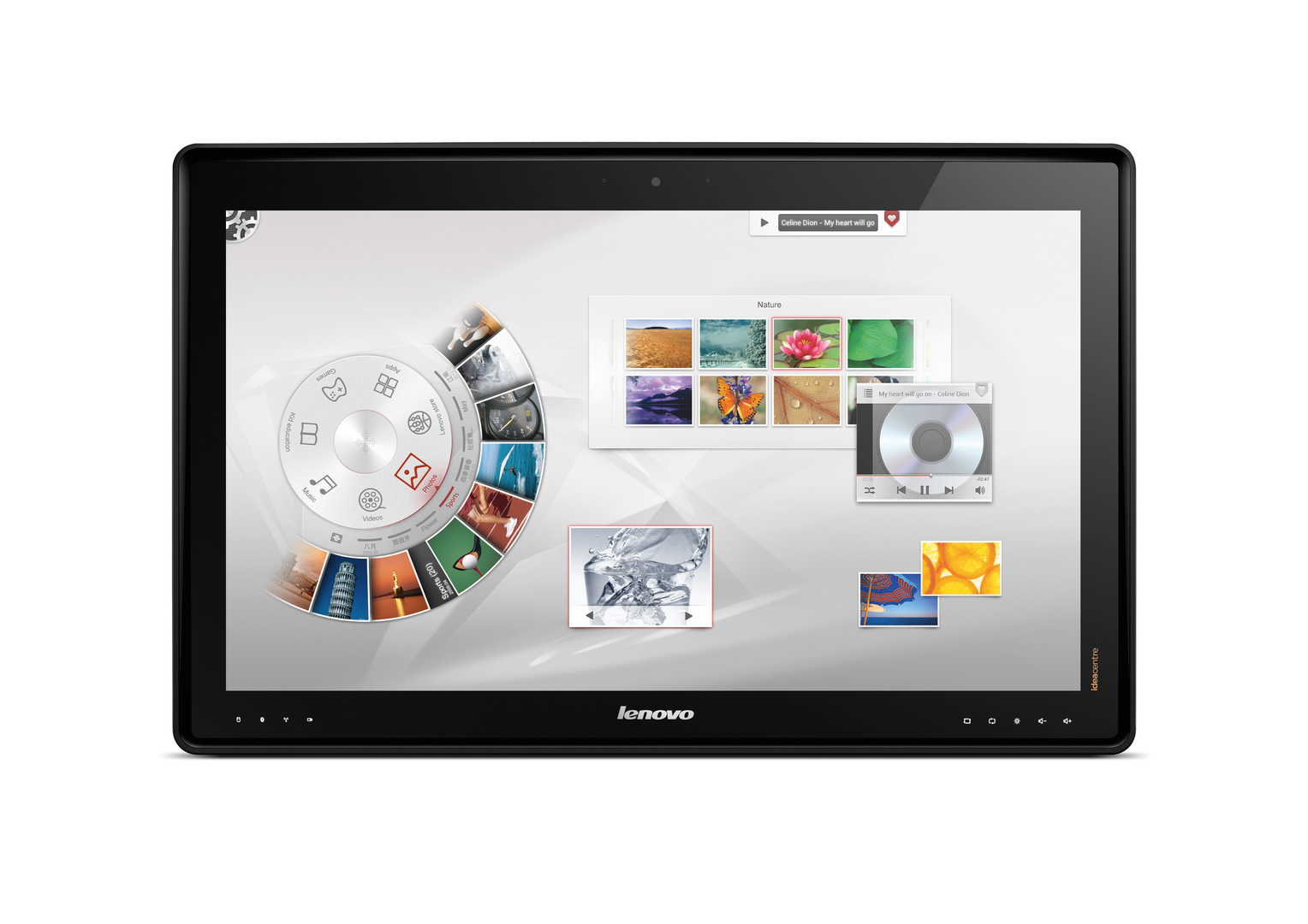 Aura is a graphical user interface for Lenovo’s Horizon Table PC. Designed as a multi-user, multi-touch device, it can be operated by several family members at the same time. Its 360-degree dial navigation enables users to easily access content from every corner of the device. Pictures, videos and music files unfold in a ring around the dial and can be interacted with through touch gestures, such as swiping, pinch-to-zooming, and more. This unique and intuitive control concept is launched when the PC is laid flat on a surface.