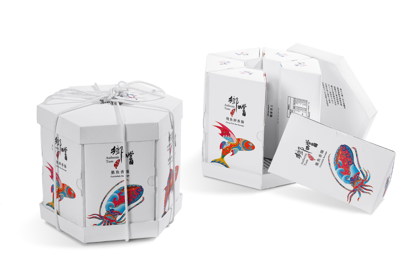 Authentic Taste is the name given to a sausage made from seafood. The various packaging types for this food feature coloured illustrations of fish and prawns against a white background, creating a feeling of freshness and purity. The brand logo combines an illustration of Taiwan with calligraphic elements. The hexagonal gift box is reminiscent of ovens which were used in the past for drying sausages. The work, the design of which reflects cultural elements of Taiwan, includes, among other things, vacuum bags, paper bags, recipes and a calendar.
