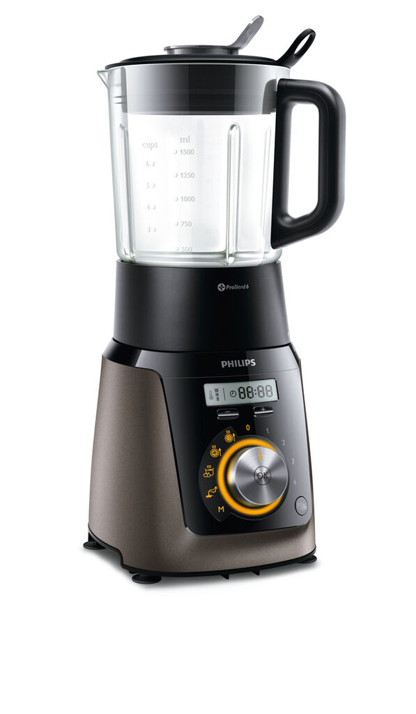 The Avance Cooking Blender has an integrated cooking function and allows speedy and simple preparation of smoothies as well as hot soups. Four programmes control combined heating and blending, while the so-called ProBlend-6 technology assures simultaneous blending, mixing, mincing and grinding. The user interface is slightly tilted and ergonomic; use of the rotary control knob is intuitive and uncomplicated – for cooking turn to the left, for blending turn to the right.