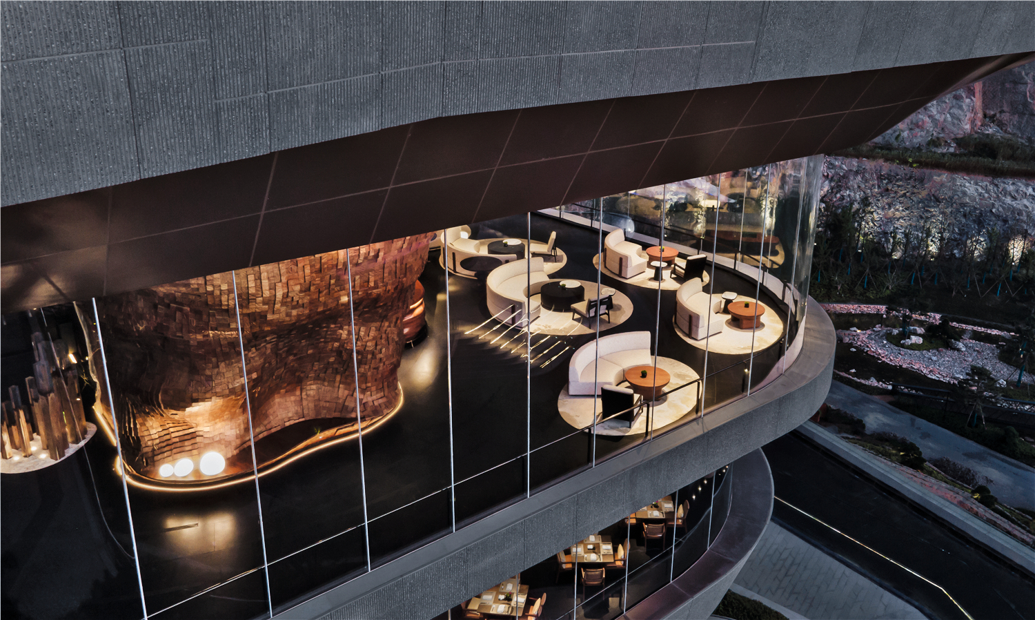 The design of this hotel, which is located in a landscape that has been severely damaged by mining, among other things, is focused on sustainability. The lobby features a minimalist style. The use of local natural materials underscores the responsible approach to the environment. With the concept “The Valley of Light”, the hotel bar conveys a canyon feeling. For this purpose, a wall reminiscent of rocks was created with the help of modern technology. In the restaurant, the interplay of light and shadow enables an emotionally appealing experience.