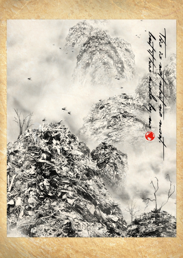 The theme of this poster is the unbelievable heaps of garbage that humans produce every day. Disguised as a picturesque landscape with a Far Eastern appeal, which beholders recognise as garbage landscapes only upon a closer look, the poster aims to raise awareness of the sheer dimensions of this problem and shows that we continue polluting our environment day by day. At first, viewers believe they are looking at mountains, kept in romantic black and white and protruding through the clouds, with birds circling high in the sky. However, when looking more closely, they reveal themselves as flies and the clouds are vapour and stench rising from the garbage piles. Such piles of garbage are to be found particularly in developing countries, where they not only pollute the ground and environment directly, but also indirectly affect the health of humans and animals in the long term. Due to the highly aesthetic appeal and the elaborately designed visual illusion, the message evinces an even more intense and striking effect.