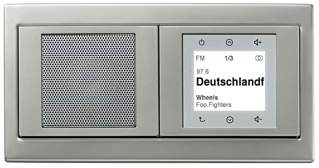 By combining a user-friendly touchscreen with a glass surface and frames matching the switch programme, the Radio Touch sets accents in terms of design. Despite its compact display size, important functions like automatic station scanning, time and date display, storage of channel frequencies and sleep mode can be accessed intuitively at the touch of a finger with the aid of clearly understandable symbols. Both the FM and the IP versions are available in the colours polar white and stainless steel.