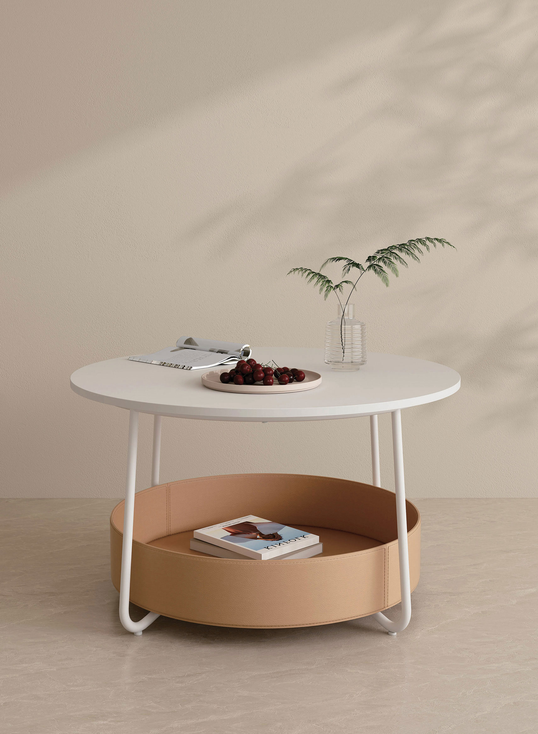 The BERNICE series uses a modular design and standardised production for easier self-assembly and component replacement. The eco-friendly countertop and open leather box provide ample storage, while hidden charging plugs ensure a clutter-free space. The simple metal frame and leather storage basket fit perfectly into small spaces, and its storage trays can be decorated, offering unlimited possibilities in function and form.