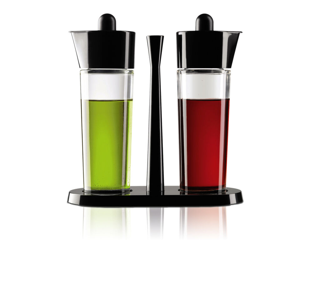 The components in this product series are made of glass. Thanks to the trays, which prevent the bottles placed on it from slipping, they can be transported safely. Of exceptional quality is the drip-free pourer of the vinegar-oil dispenser, which can be adjusted in three intensities – from medium to strong. The ceramic grinder of the spice mills can also be adjusted individually from fine to coarse.