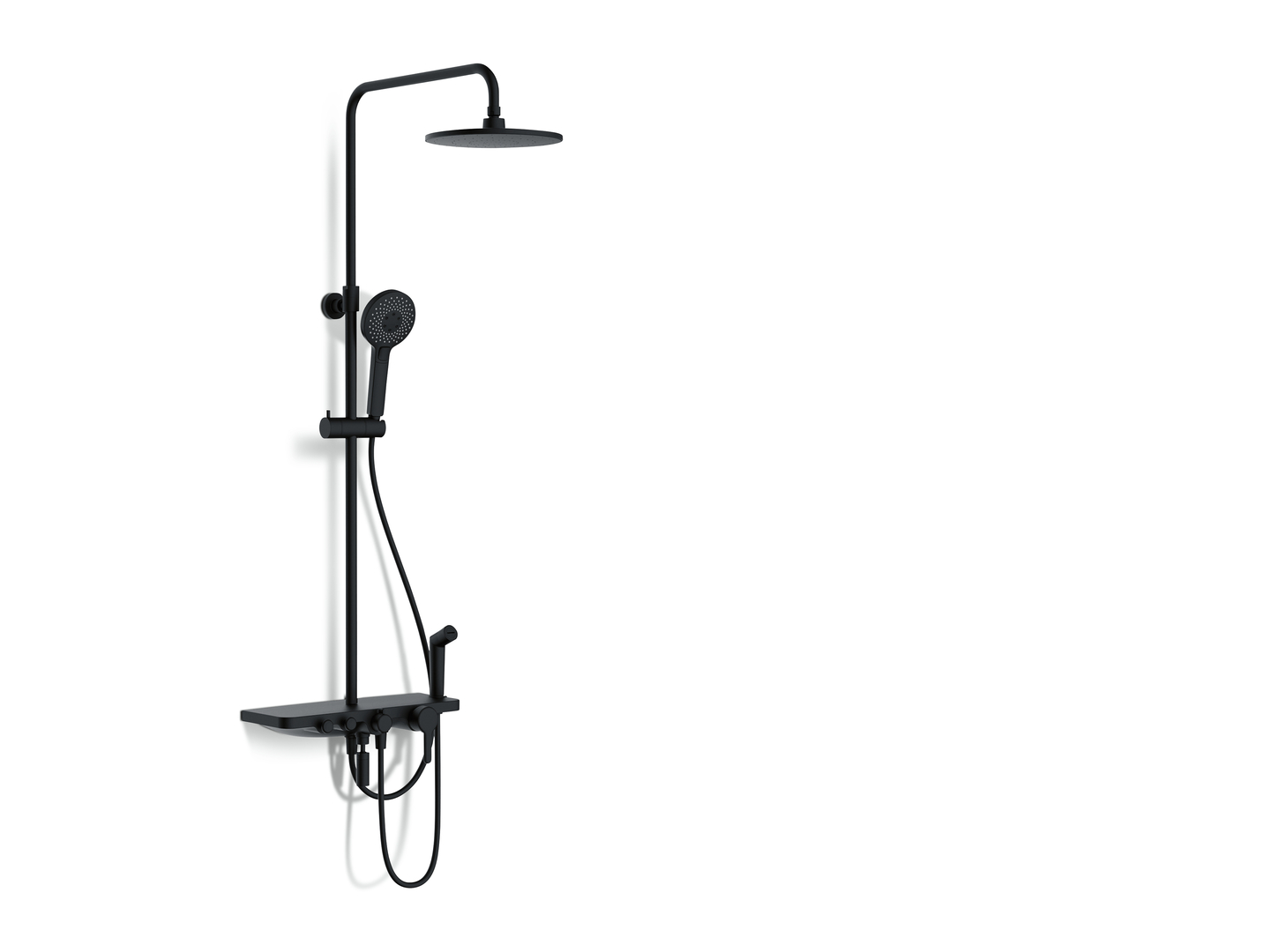 The fitting of this matt black shower system comprises a mixer and shelf in one. Showcasing rounded edges, the rectangular surface offers sufficient space for care products and accessories. Two small round hooks can be used to hang flannels or massage gloves. The different spray types are controlled via a centrally positioned rotary knob that can be conveniently operated with one hand. Water flow and temperature can be adjusted via a mixer lever that ensures a secure grip.