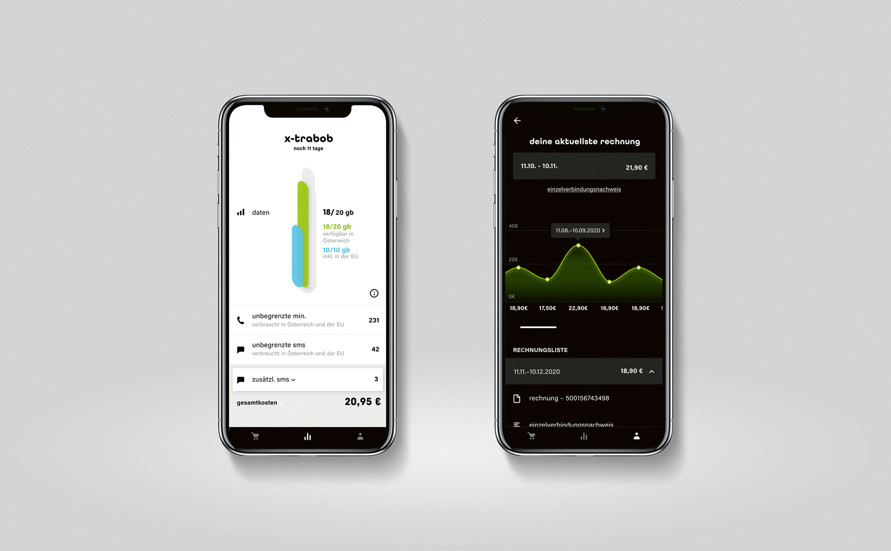 bob is a brand of A1 Telekom Austria in the field of mobile communications services. In line with the development of a completely new brand appearance, the user concept for the bob app has also been revised after integrating collected user feedback. The aim was to create an intuitive, uniform and user-centred brand. The app enables users to quickly check their mobile phone costs and consumption, to adjust settings and to browse through current offers. Featuring a clear overview, it provides them with complete, transparent control over expenses, to avoid any nasty surprises at the end of the month.