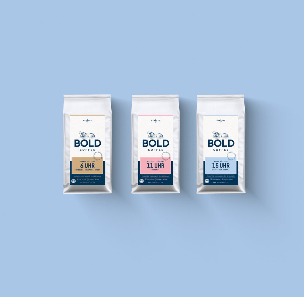 BOLD COFFEE is a coffee brand recently launched on the German market with a distinctive product concept: depending on the time of day, customers can choose between light, medium or dark roast coffee. The likeable and casual appearance is based on an illustration of the brand mascot, a hippopotamus. In terms of design, the illustration refers to the product and product names as well as the modernity of a well-spaced sans serif logotype. A part of the sale proceeds is donated to support targeted measures to protect hippopotamus populations threatened by poaching.