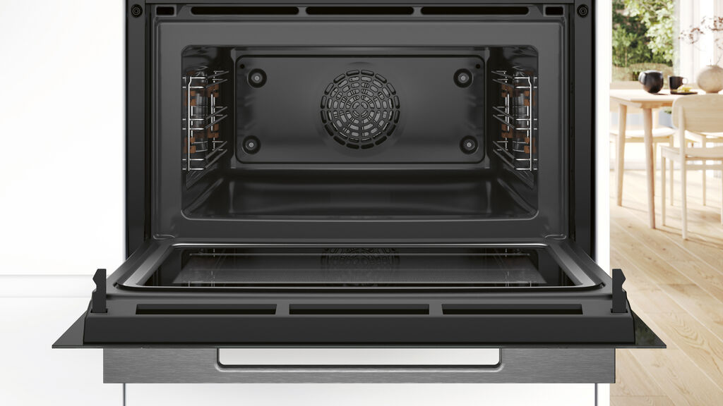 The Bosch Series 8 Built-in Generation is a high-quality combination of intuitively operated built-in ovens with a digital user interface. The control ring engraved in the glass surface and the high-resolution TFT touch display allow for convenient use of a wide range of programmes. The series not only impresses technically with conventional heating types and a microwave function, but also with a new steam function for gentle cooking at 120 degrees centigrade, an integrated Air Fry function and a warming tray.