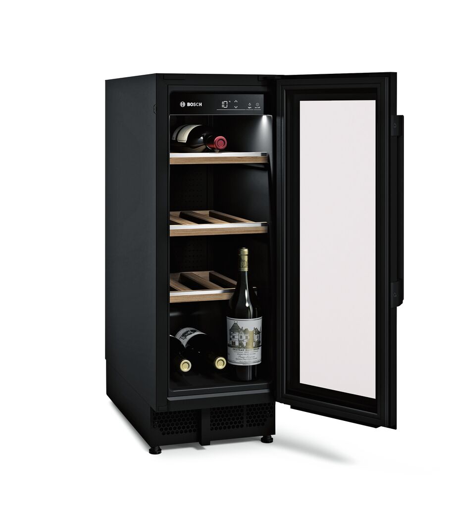 The BOSCH Wine Cabinets Built-under Range scores with its elegant black exterior, which has been scaled down to the essentials. The use of high-quality materials such as glass, wood, and metal promises quality and reliability. The oak shelves with their brushed aluminium profiles create an exciting contrast. The frameless glass door provides excellent visibility and the opportunity to present the wines in the best possible way thanks to the dimmable light.