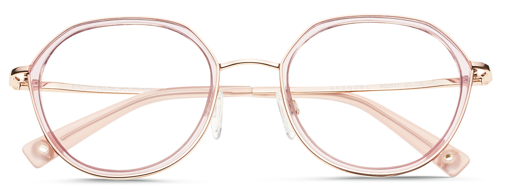 The panto shape of these women’s glasses is characterised by a geometric accentuation of the upper eye-rim. The inner and outer contours differ in strength, creating a dynamic impression. The transparent T15 material of the front in a cool light grey is embedded in a shiny stainless-steel frame in rose gold. The temple tips in transparent acetate emphasise the lightness and the narrow integrated spring hinge provides additional wearing comfort.