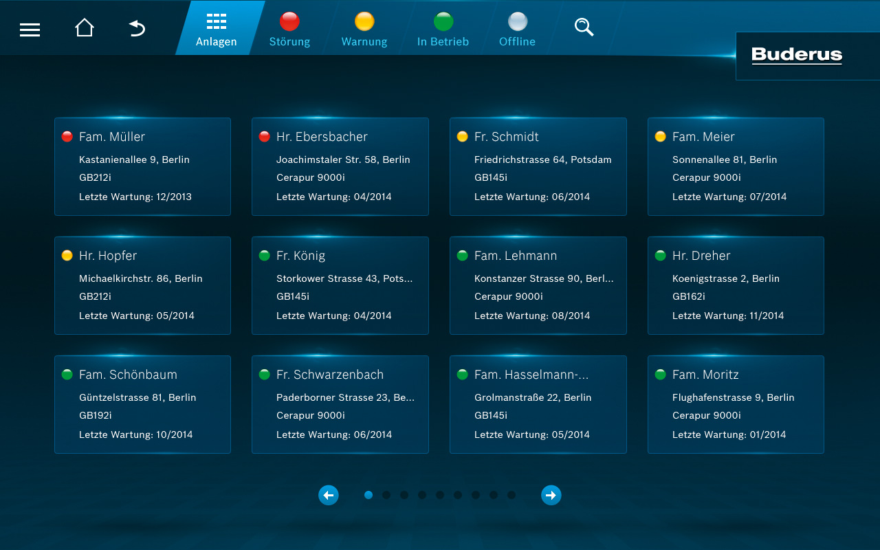 The Buderus Control Center ConnectPRO offers heating contractors a whole new range of servicing options. This interface allows the company’s new heating systems to be conveniently controlled from the office PC or from a tablet whilst on the go, featuring straightforward menu navigation and a personal login area. It provides practical information as well as a status overview of all connected systems. The portal application offers comprehensive assistance in the event of a fault or a required service call, which facilitates troubleshooting.