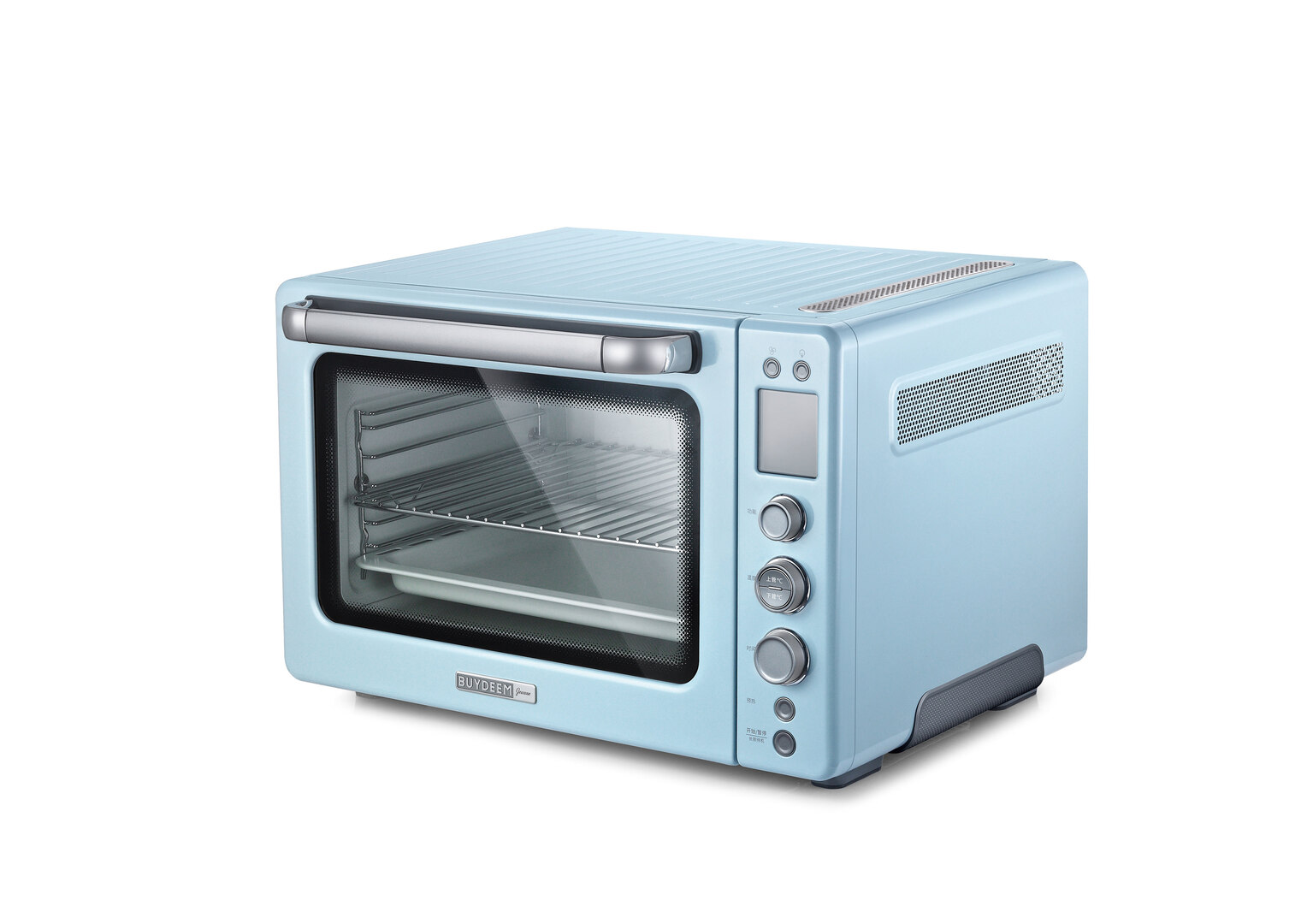The appearance of this oven combines retro design elements with contemporary components, for example, an LCD display. The oven has a generously dimensioned cooking chamber of 49 litres whose smooth surface is coated with ceramic, thus contributing to the long life of the appliance. The handle is located above the cooking chamber and window so that it does not heat up and can be safely operated. The user interface blends into the overall look harmoniously, being designed with an LCD display and knobs so that the operation of the oven is convenient and intuitive.