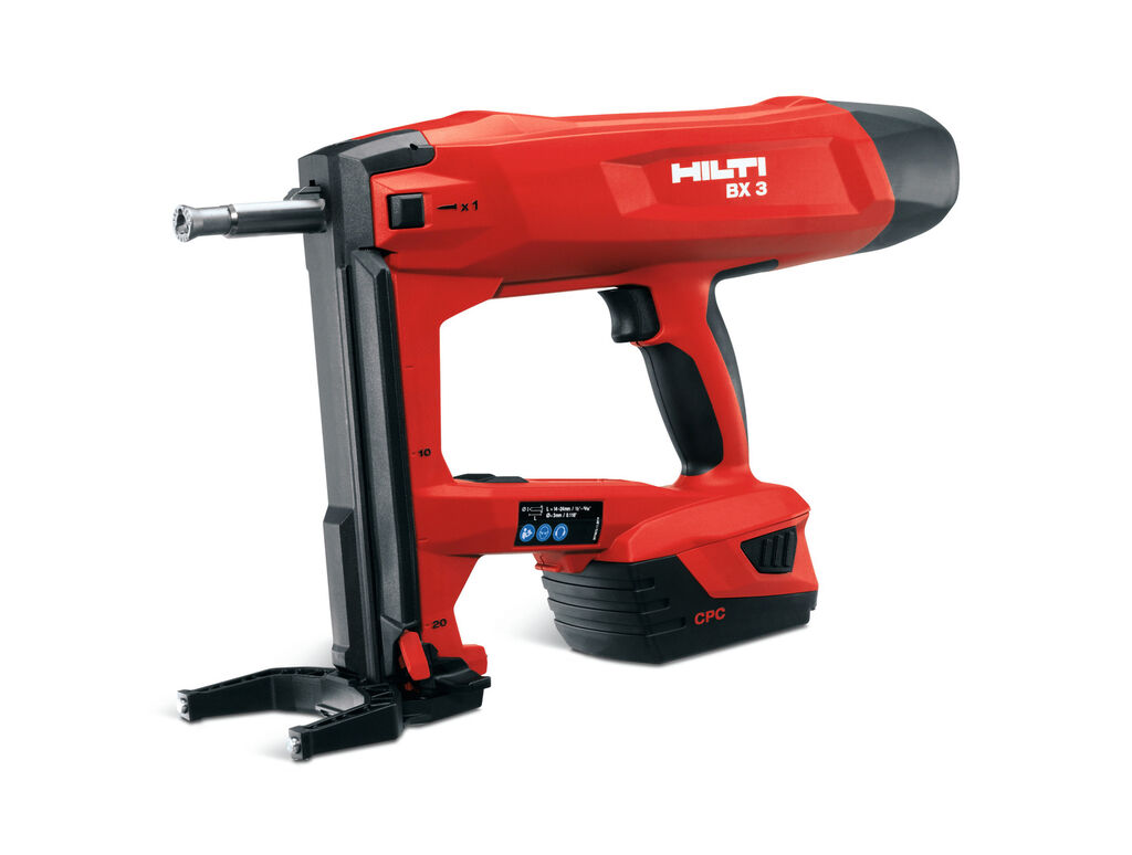The BX 3 was developed for cordless use and enables the driving of nails into concrete, solid brick and steel. The housing encases the motor, tensioning belt and springs in an unusually asymmetrical, optimally balanced form. The dimensions and weight are reduced to a minimum, making the device easy to use. In addition, the power tool features an ergonomic, anti-slip and vibration-absorbing handle, as well as a support foot with a scaffolding hook. An LED lamp shows the current charge status of the battery.