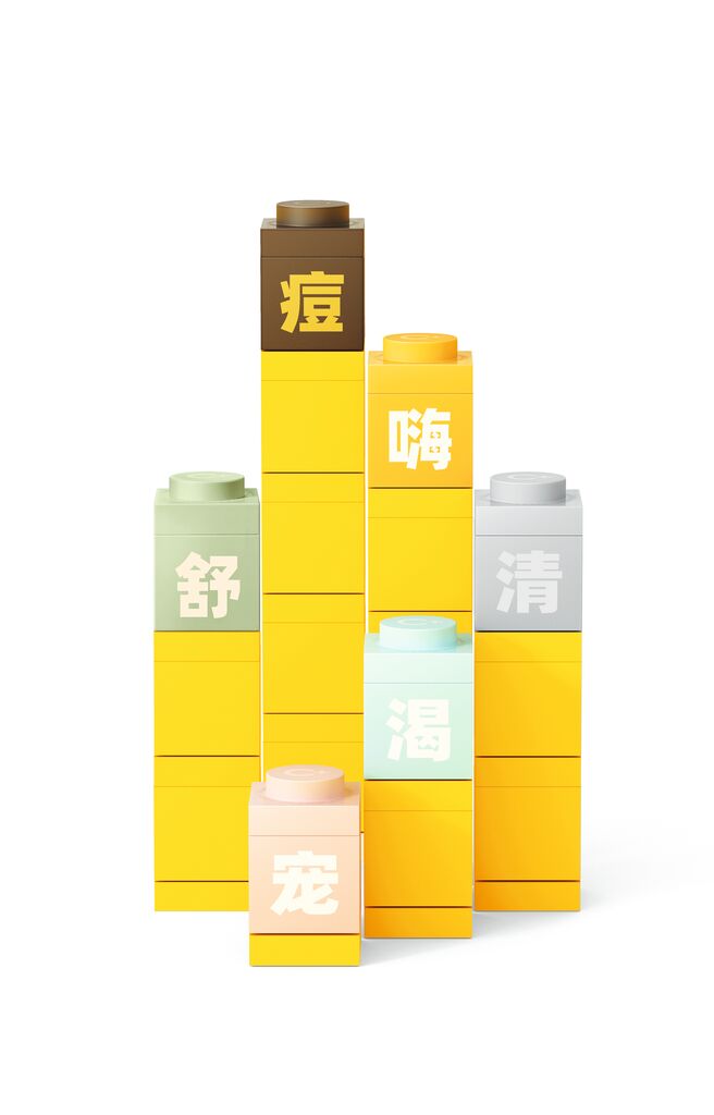 Like well-known interlocking construction toys, these cosmetic facial masks can safely be stacked on top of each other. The lids of the cube-shaped jars feature a raised section that fits into the hollow at the base of others. This design references the flexible skincare concept of the brand. In combination with the large Chinese characters, a cheerful colour palette is used to distinguish between the various products.