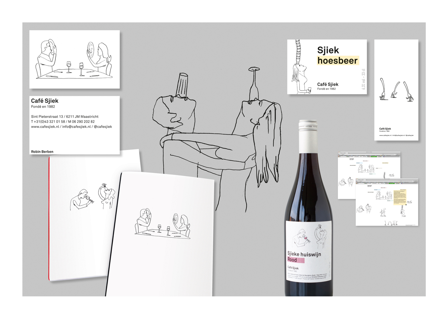 The corporate identity of Café Sjiek reflects culinary pleasure in a highly likeable manner. The well-known restaurant in Maastricht presents itself as a smaller version of the French Grand Café and offers a huge outdoor patio in the historic city park in summer. On advertising media and menus a discreet typography is complemented by sketch-like drawings, which show a couple in the restaurant. Humorous scenes, such as the balancing of glasses or the couple using plates as mirrors, surprise the beholder and visualise the restaurant’s special flair.
