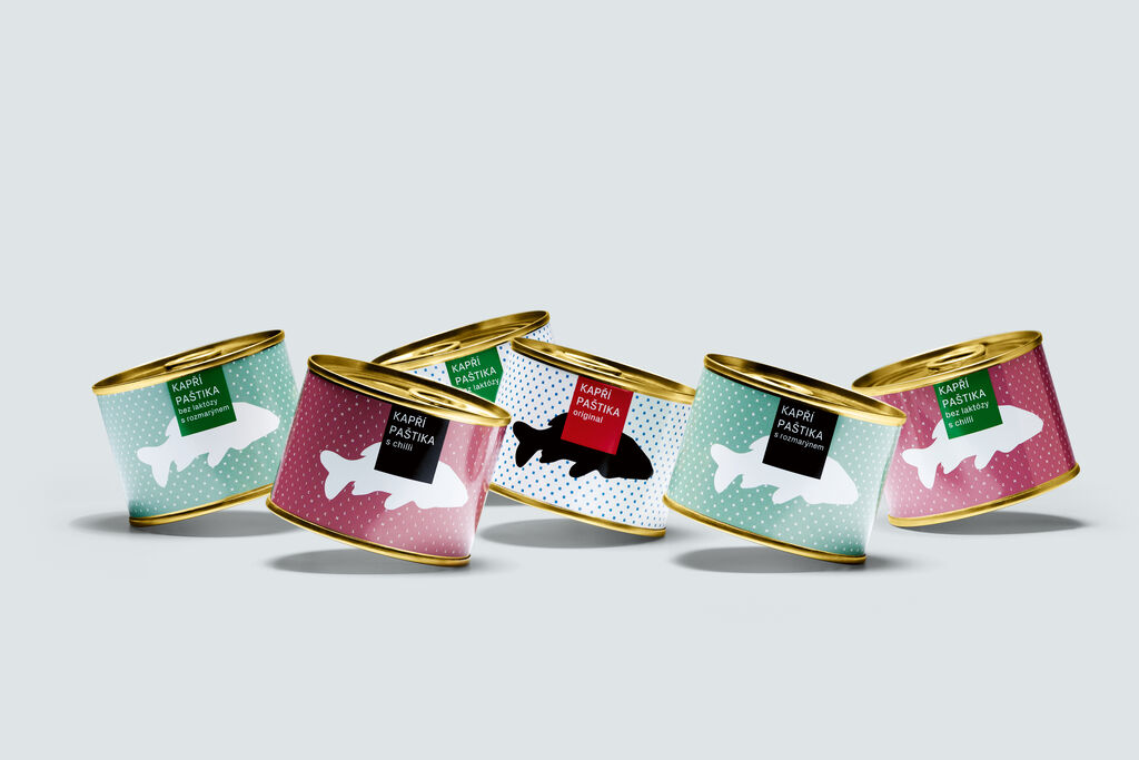 Czech company Hospodářský dvůr POŘÍČÍ markets pâtés made from high-quality organic carp under the brand name Carp pâté. The logo combines the silhouette of a carp with a coloured label displaying the brand name and type of pâté. Used across all communication channels, the striking logo – generally presented on a background with a subtle grid pattern – ensures strong brand recognition. The packaging design picks up on the key design elements and is positioned to look like gift packaging to immediately convey the premium quality of the food item at the point of sale.
