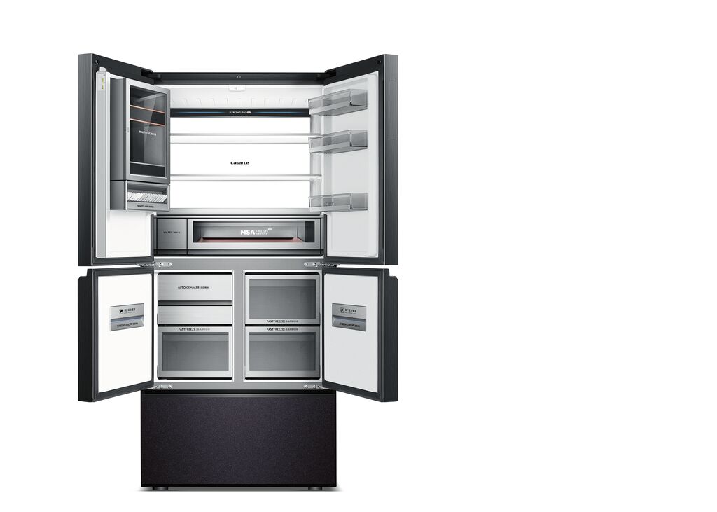 Casarte Tiancheng F combines functional design with a high-quality selection of materials and colours, making this refrigerator an attractive kitchen appliance. The differentiated interior design with white and grey zones optimises the easy storage of different foods. Smart features, such as voice control or sustainable food management via the TFT display, enable convenient use.