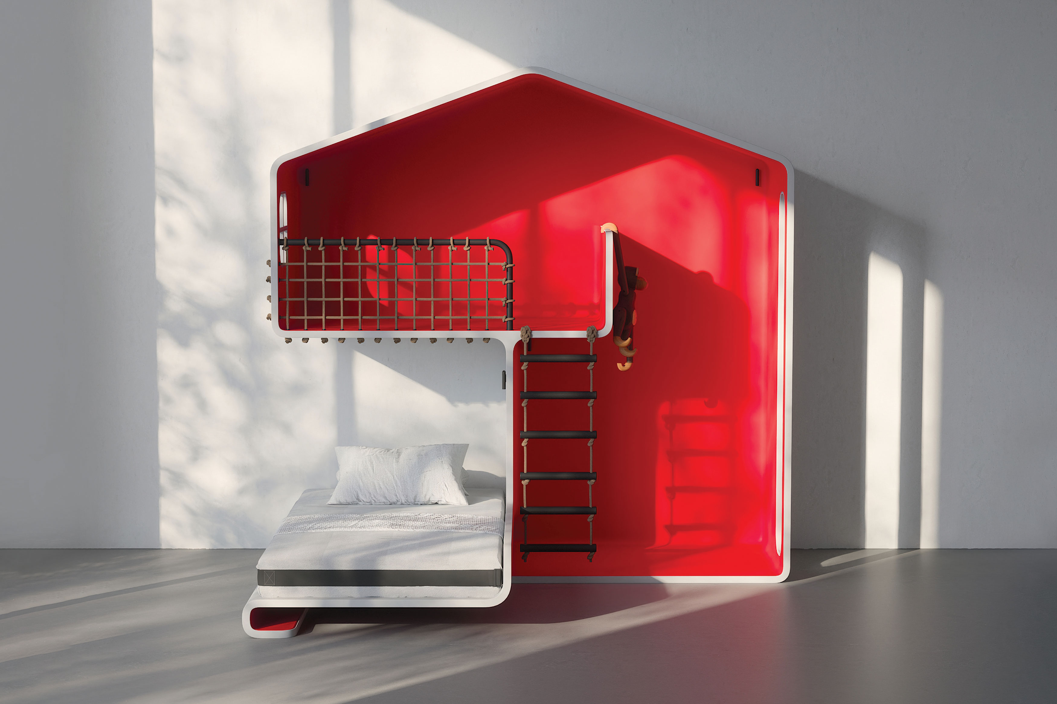 CASTLE FAMILY’s enchanting curves integrate a bed, bookcase, and spacious drawer into one cohesive, playful design. Crafted from durable solid wood and coloured polyurethane coating in vibrant hues, it provides a dreamlike haven for children with its safe and gentle arcs. Its multifunctionality makes it a versatile piece of furniture that adapts to the evolving needs of a growing child.
